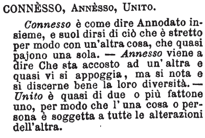 | Connesso, Annesso, Unito - Connesso è come dire Annodato insieme, e suol dirsi di ciò che è stretto per modo con un'altra cosa, che quasi pajono una sola. - Annesso viene a dire Che sta accosto ad un'altra e quasi vi si appoggia, ma si nota e si discerne bene la loro diversità. - Unito è quasi di due o più fattone uno, per modo che l'una cosa o persona è soggetta a tutte le alterazioni dell'altra. [immagine] |