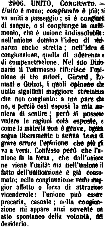 | Unito, Congiunto - Unito è meno; congiunto è più; si va uniti a passeggio; si è congiunti di sangue, o si congiunge in matrimonio, che è unione indissolubile: nell'unione domina l'idea di vicinanza anche stretta; nell'idea di congiunzione, quella di aderenza e di compenetrazione. Nel suo Dizionario il Tommaseo riferisce l'opinione di tre autori, Girard, Romani e Guizot, i quali opinano che unito significhi maggiore strettezza che non congiunto: a me pare che no, e perciò così esposi la mia maniera di sentire; però si possono vedere le ragioni colà esposte, e come la materia non è grave, ognun segua liberamente e senza tema di grave errore l'opinione che più gli va a versi. Confesso però che l'unione fa la forza, che dall'unione ne viene l'unità: ma nell'unione il fatto dell'unificazione è già consumato; nella congiunzione vedo maggior affetto o forza di attrazione vicendevole: l'unione può essere precaria, casuale; nella congiunzione mi appare anzi sovente un atto spontaneo della volontà, del desiderio. [immagine] |