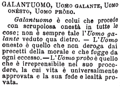 | Galantuomo, Uomo galante, Uomo onesto, Uomo probo - Galantuomo è colui che procede con scrupolosa onestà in tutte le cose; non è sempre tale l'Uomo galante veduto qua dietro. - L'Uomo onesto è quello che non deroga dai precetti della morale e che fugge da ogni eccesso. - L'Uomo probo è quello che è irreprensibile nel suo procedere, la cui vita è universalmente approvata e la sua fede e lealtà provata. [immagine] |