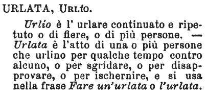 | Urlata, Urlio - Urlío è l'urlare continuato e ripetuto o di fiere, o di più persone. - Urlata è l'atto di una o più persone che urlino per qualche tempo contro alcuno, o per sgridare, o per disapprovare, o per ischernire, e si usa nella frase Fare un'urlata o l'urlata. [immagine] |