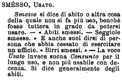 Smesso, Usato - Smesso si dice di abito o altra cosa della quale non si fa più uso, benchè fosse tuttora in grado da potersi usare. - «Abiti smessi. - Seggiole smesse.» E anche suol dirsi di persona che abbia cessato di esercitare un ufficio. «Birri smessi.» - La voce Usato invece suona Consunto per il lungo uso, e non più usabile con decenza. Si dice generalmente degli abiti. [immagine]
