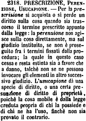 | Prescrizione, Perenzione, Usucapione - Per la prescrizione si acquista o si perde un diritto sulla cosa quando sia trascorso il termine prescritto appunto dalla legge: la perenzione non agisce sulla cosa direttamente, ma sul giudizio instituito, se non è proseguito fra i termini fissati dalla procedura; la quale in questo caso cessa e resta estinta sia a favore che a danno, talchè non se ne possono invocare gli elementi in altro successivo giudizio. L'usucapione dà una specie di diritto, o una certa presunzione di diritto di proprietà, poichè la cosa mobile è dalla legge creduta propria di chi la possiede e di chi ne ha l'uso, finchè non sia provato il contrario. [immagine] |
