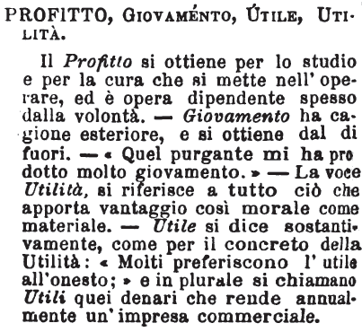 Profitto, Giovamento, Utile, Utilità - Il Profitto si ottiene per lo studio e per la cura che si mette nell'operare, ed è opera dipendente spesso dalla volontà. - Giovamento ha cagione esteriore, e si ottiene dal di fuori. - «Quel purgante mi ha prodotto molto giovamento.» - La voce Utilità, si riferisce a tutto ciò che apporta vantaggio così morale come materiale. - Utile si dice sostantivamente, come per il concreto della Utilità: «Molti preferiscono l'utile all'onesto;» e in plurale si chiamano Utili quei denari che rende annualmente un'impresa commerciale. [immagine]