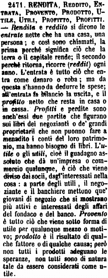 Rendita, Reddito, Entrata, Provento, Prodotto, Utile, Utili, Profitto, Profitti - Rendita e reddito si dicono le entrate nette che ha una casa, una persona; e così sono chiamati, la prima perchè significa ciò che la terra o il capitale rende; il secondo perchè ritorna, ricorre (reddit) ogni anno. L'entrata è tutto ciò che entra come danaro o roba; ma da questa s'hanno da dedurre le spese; all'entrata fa bilancio la uscita, e il profitto netto che resta in casa o in cassa. Profitti e perdite sono anch'essi due partite che figurano sui libri dei negozianti o de' grandi proprietarii che non puonno fare a menadito i conti del loro patrimonio, ma hanno bisogno di libri. L'utile o gli utili, cioè il guadagno assoluto che dà un'impresa o commercio qualunque, è ciò che viene diviso dai socii, dagl'interessati nella cosa: a parte degli utili, il negoziante e il banchiere mettono que' giovani di negozio che si mostrano più attivi e interessati degli affari del fondaco e del banco. Provento è tutto ciò che viene sotto forma di utile per qualunque mezzo o motivo; prodotto è il risultato di qualche fattore o di qualche causa; però non tutti i prodotti adeguano le speranze, non tutti sono di natura tale da essere considerati come utile. [immagine]