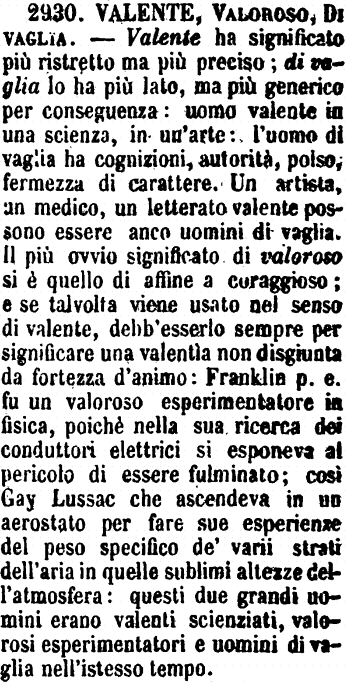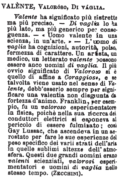 | Valente, Valoroso, Di vaglia - Valente ha significato più ristretto ma più preciso. - Di vaglia lo ha più lato, ma più generico per conseguenza. - «Uomo valente in una scienza, in un'arte.» - L'uomo di vaglia ha cognizioni, autorità, polso, fermezza di carattere. Un artista, un medico, un letterato valente possono essere anco uomini di vaglia. Il più ovvio significato di Valoroso si è quello di affine a Coraggioso, e se talvolta viene usato nel senso di Valente, debb'esserlo sempre per significare una valentia non disgiunta da fortezza d'animo. Franklin, per esempio, fu un valoroso esperimentatore in fisica, poiché nella sua ricerca dei conduttori elettrici si esponeva al pericolo di essere fulminato; così Gay Lussac, che ascendeva in un aerostato per fare le sue esperienze del peso specifico dei varii strati dell'aria in quelle sublimi altezze dell'atmosfera. Questi due grandi uomini erano valenti scienziati, valorosi esperimentatori e uomini di vaglia nella stesso tempo. (Zecchini). [immagine] |