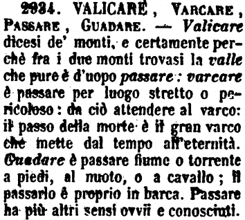 Valicare, Varcare, Passare, Guadare - Valicare dicesi de' monti, e certamente perchè fra i due monti trovasi la valle che pure è d'uopo passare: varcare è passare per luogo stretto o pericoloso: da ciò attendere al varco: il passo della morte è il gran varco che mette dal tempo all'eternità. Guadare è passare fiume o torrente a piedi, al nuoto, o a cavallo; il passarlo è proprio in barca. Passare ha più altri sensi ovvii e conosciuti. [immagine]