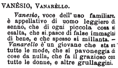 Vanesio, Vanarello - Vanesio, voce dell'uso familiare, è appellativo di uomo leggiero di senno, che di ogni piccola cosa si esalta, che si pasce di false immagini di bene, e che spesso si millanta. - Vanarello è un giovane che sta su tutte le mode, che si pavoneggia di cose da nulla, che fa il grazioso con tutte le donne, e altre grullaggini. [immagine]