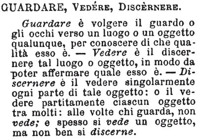 Guardare, Vedere, Discernere - Guardare è volgere il guardo o gli occhi verso un luogo o un oggetto qualunque, per conoscere di che qualità esso è. - Vedere è il discernere tal luogo o oggetto, in modo da poter affermare quale esso è. - Discernere è il vedere singolarmente ogni parte di tale oggetto: o il vedere partitamente ciascun oggetto tra molti: alle volte chi quarda, non vede; e spesso si vede un oggetto, ma non ben si discerne. [immagine]