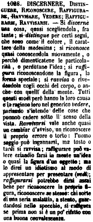 Discernere, Distinguere, Riconoscere, Raffigurare, Ravvisare, Vedere; Raffigurarsi, Ravvisarsi - Si discerne una cosa, quasi scegliendola, fra tante; si distingue per certi segni, che sono come il colore, il carattere della medesima; si riconosce quasi conoscendola nuovamente, o perchè dimenticatene le particolarità, o perdutane l'idea; si raffigura riconoscendone la figura, la forma speciale; si ravvisa o rivedendola cogli occhi del corpo, o anche con quelli della mente. Tutti questi modi però hanno la loro causa e la ragione loro nel generico vedere, parlando s'intende delle cose che puonno cadere sotto il senso della vista. Ravvisarsi vale anche quasi un cambiar d'avviso, un riconoscere il proprio errore o torto: l'uomo saggio può ingannarsi, ma tosto o tardi si ravvisa; raffigurare può valere eziandio farsi in mente un'idea o quasi la figura d'un oggetto; ma lo direi un idiotismo al modo di appresentare per presentare (vedi); raffigurarsi potrebbe dirsi assai bene per riconoscere la propria figura, riconoscere se stesso: chi sorte di una seria malattia, a stento, guardandosi nello specchio, si raffigura se prima non si è un po' rifatto con una buona convalescenza. [immagine]