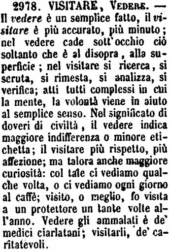 Visitare, Vedere - Il vedere è un semplice fatto, il visitare è più accurato, più minuto; nel vedere cade sott'occhio ciò soltanto che è al disopra, alla superficie; nel visitare si ricerca, si scruta, si rimesta, si analizza, si verifica; atti tutti complessi in cui la mente, la volontà viene in aiuto al semplice senso. Nel significato di doveri di civiltà, il vedere indica maggiore indifferenza o minore etichetta; il visitare più rispetto, più affezione; ma talora anche maggiore curiosità: col tale ci vediamo qualche volta, o ci vediamo ogni giorno al caffè; visito, o meglio, fo visita a un protettore un tante volte all'anno. Vedere gli ammalati è de' medici ciarlatani; visitarli, de' caritatevoli. [immagine]