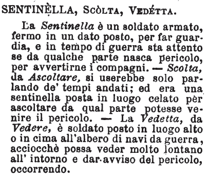 Sentinella, Scolta, Vedetta - La Sentinella è un soldato armato, fermo in un dato posto, per far guardia, e in tempo di guerra sta attento se da qualche parte nasca pericolo, per avvertirne i compagni. - Scolta, da Ascoltare, si userebbe solo parlando de' tempi andati; ed era una sentinella posta in luogo celato per ascoltare da qual parte potesse venire il pericolo. - La Vedetta, da Vedere, è soldato posto in luogo alto o in cima all'albero di navi da guerra, acciocchè possa veder molto lontano all'intorno e dar avviso del pericolo, occorrendo. [immagine]
