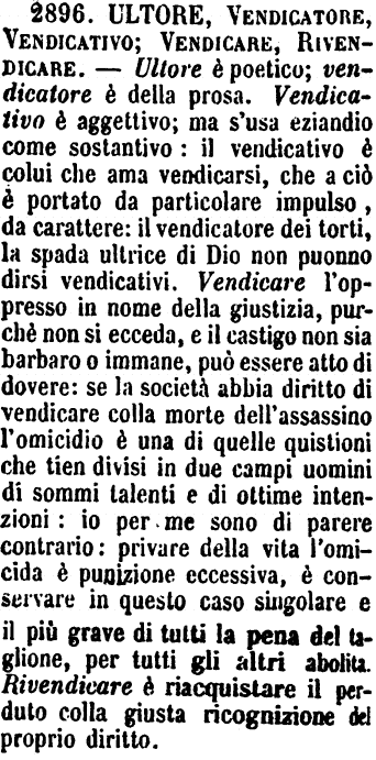 Ultore, Vendicatore, Vendicativo; Vendicare, Rivendicare - Ultore è poetico; vendicatore è della prosa. Vendicativo è aggettivo; ma s'usa eziandio come sostantivo: il vendicativo è colui che ama vendicarsi, che a ciò è portato da particolare impulso, da carattere: il vendicatore dei torti, la spada ultrice di Dio non puonno dirsi vendicativi. Vendicare l'oppresso in nome della giustizia, purchè non si ecceda, e il castigo non sia barbaro o immane, può essere atto di dovere: se la società abbia diritto di vendicare colla morte dell'assassino l'omicidio è una di quelle quistioni che tien divisi in due campi uomini di sommi talenti e di ottime intenzioni: io per me sono di parere contrario: privare della vita l'omicida è punizione eccessiva, è conservare in questo caso singolare e il più grave di tutti la pena del taglione, per tutti gli altri abolita. Rivendicare è riacquistare il perduto colla giusta ricognizione del proprio diritto. [immagine]