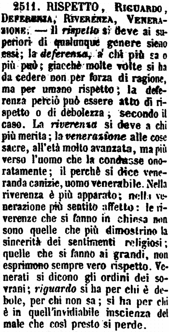 | Rispetto, Riguardo, Deferenza, Riverenza, Venerazione - Il rispetto si deve ai superiori di qualunque genere sieno essi; la deferenza, a chi più sa o più può; giacchè molte volte si ha da cedere non per forza di ragione, ma per umano rispetto; la deferenza perciò può essere atto di rispetto o di debolezza, secondo il caso. La riverenza si deve a chi più merita; la venerazione alle cose sacre, all'età molto avanzata, ma più verso l'uomo che la condusse onoratamente; il perchè si dice veneranda canizie, uomo venerabile. Nella riverenza è più apparato; nella venerazione più sentito affetto: le riverenze che si fanno in chiesa non sono quelle che più dimostrino la sincerità dei sentimenti religiosi; quelle che si fanno ai grandi, non esprimono sempre vero rispetto. Venerati si dicono gli ordini dei sovrani; riguardo si ha per chi è debole, per chi non sa; si ha per chi è in quell'invidiabile inscienza del male che così presto si perde. [immagine] |