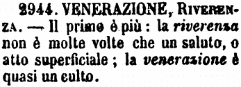 | Venerazione, Riverenza - Il primo è più: la riverenza non è molte volte che un saluto, o atto superficiale; la venerazione è quasi un culto. [immagine] |