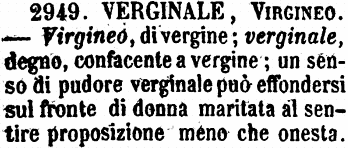 | Verginale, Virgineo - Virgineo, di vergine; verginale, degno, confacente a vergine; un senso di pudore verginale può effondersi sul fronte di donna maritata al sentire proposizione meno che onesta. [immagine] |