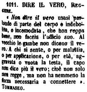 | Dire il vero, Reggere - «Non dire il vero usasi parlando di parte del corpo o indebolita, o incomodata, che non regga bene, non faccia l'ufficio suo. Al vecchio le gambe non dicono il vero. A chi si sente, o per malattia, o per applicazione, o per età, aggravata o vuota la testa, il capo non dice più il vero; cioè non solo non regge, ma non ha nemmeno la forza necessaria a connettere». Tommaseo. [immagine] |