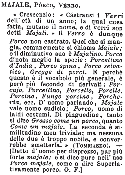 Majale, Porco, Verro - «Crescenzio: «Cástransi i Verri dell'età di un anno; la qual cosa fatta, mutano il nome, e di verri son detti Majali.» Il Verro è dunque Porco non castrato. Quel che si mangia, comunemente si chiama Majale; e il diminutivo suo è Majalino. Porco dinota meglio la specie: Porcellino d'India, Porco spino, Porco selvatico, Gregge di porci. E perchè questo è il vocabolo più generale, è però più fecondo di derivati: Porcajo, Porcellino, Porcello, Porcile, Porcino, Fungo porcino, Porcheria, ecc. D'uomo parlando, Majale vale uomo sudicio; Porco, uomo di laidi costumi. Di pinguedine, tanto si dice Grasso come un porco, quanto Come un majale. La seconda è similitudine men triviale; ma nessuna delle due è troppo nobile, e converrebbe smetterla.» (Tommaseo). - [Detto d'uomo per disprezzo, par più forte majale; e si dice pure nell'uso Porco majale, come a dire Superlativamente porco. G. F.] [immagine]
