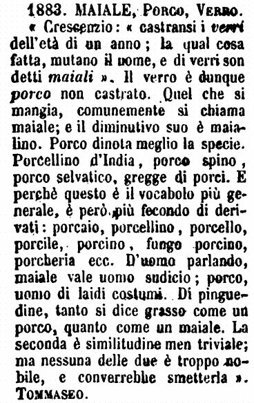 Maiale, Porco, Verro - « Crescenzio: « castransi i verri dell'età di un anno; la qual cosa fatta, mutano il nome, e di verri son detti maiali ». Il verro è dunque porco non castrato. Quel che si mangia, comunemente si chiama maiale; e il diminutivo suo è maialino. Porco dinota meglio la specie. Porcellino d'India, porco spino, porco selvatico, gregge di porci. E perchè questo è il vocabolo più generale, è però più fecondo di derivati: porcaio, porcellino, porcello, porcile, porcino, fungo porcino, porcheria ecc. D'uomo parlando, maiale vale uomo sudicio; porco, uomo di laidi costumi. Di pinguedine, tanto si dice grasso come un porco, quanto come un maiale. La seconda è similitudine men triviale; ma nessuna delle due è troppo nobile, e converrebbe smetterla ». Tommaseo. [immagine]