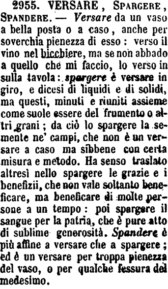 | Versare, Spargere, Spandere - Versare da un vaso a bella posta o a caso, anche per soverchia pienezza di esso: verso il vino nel bicchiere, ma se non abbado a quello che mi faccio, lo verso in sulla tavola: spargere è versare in giro, e dicesi di liquidi e di solidi, ma questi, minuti e riuniti assieme come suole essere del frumento o altri grani; da ciò lo spargere la semente ne' campi, che non è un versare a caso ma sibbene con certa misura e metodo. Ha senso traslato altresì nello spargere le grazie e i benefizii, che non vale soltanto beneficare, ma beneficare di molte persone a un tempo: poi spargere il sangue per la patria, che è pure atto di sublime generosità. Spandere è più affine a versare che a spargere; ed è un versare per troppa pienezza del vaso, o per qualche fessura del medesimo. [immagine] |