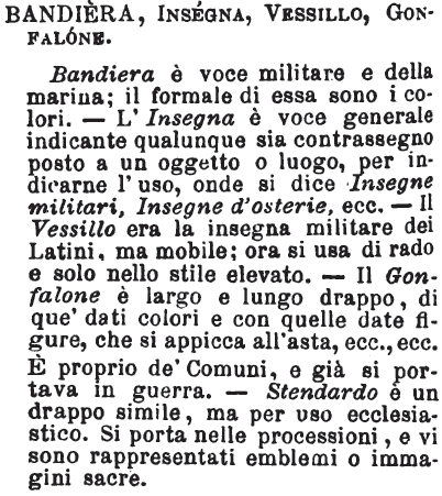 | Bandiera, Insegna, Intrasegna, Impresa, Stendardo, Gonfalone, Vessillo, Pennone - Bandiera è propriamente insegna militare; la bandiera però della nazione è spiegata anche da ogni bastimento di quella, sia da guerra o mercantile; alla bandiera portata da vascelli da guerra si rendono fra nazione e nazione, fra vascello e vascello, sia ne' porti che in alto mare, certi convenuti onori. Insegna è parola generica; è segno o contrasegno qualunque indicante quella tal cosa cui è destinato; insegna di mercante, d'osteria ecc.; insegne militari. Impresa era motto e simbolo che il cavaliere adottava onde dichiarare quali erano o intendeva fossero le meglio imprese sue; la portava scritta o figurata sullo scudo principalmente: divenuta poi quella della sua famiglia e discendenti, era come chi dicesse l'insegna della casa, in quei tempi in ispecie in cui ogni signorotto ne' suoi contorni era sovrano. Stendardo è più generalmente l'insegna che le compagnie religiose o secolari portano nelle processioni; è differente dal gonfalone in quanto quello è attaccato all'asta a modo di bandiera cioè dall'uno de' lati, e si porta coll'asta alquanto inclinata, onde resti steso e si veda ciò che rappresenta; il gonfalone invece è appeso per il mezzo del lato superiore a un'asta, che si porta diritta, onde resti spiegato; il lato superiore è fisso a un traverso di legno: il gonfalone era anco l'insegna del Comune e portavasi nelle battaglie; il gonfaloniere era, ed è tuttora in qualche parte d'Italia, uno de' primi magistrati. Vessillo è voce dello stile nobile; il vessillo del re, dell'imperatore; la croce è il vessillo della cristianità tutta. Pennone è una piccola banderuola, finente in due punte, attaccata o in cima della lancia, o dell'albero maggiore delle navi; questo serve il più sovente a indicare da qual parte spira il vento.