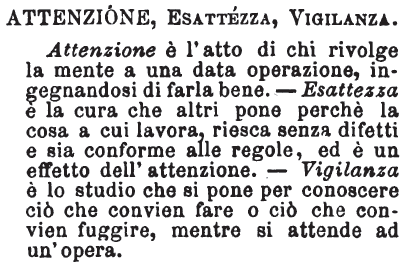 Attenzione, Esattezza, Vigilanza - Attenzione è l'atto di chi rivolge la mente a una data operazione, ingegnandosi di farla bene. Esattezza è la cura che altri pone perchè la cosa a cui lavora, riesca senza difetti e sia conforme alle regole, ed è un effetto dell'attenzione. Vigilanza è lo studio che si pone per conoscere ciò che convien fare o ciò che convien fuggire, mentre si attende ad un'opera. [immagine]