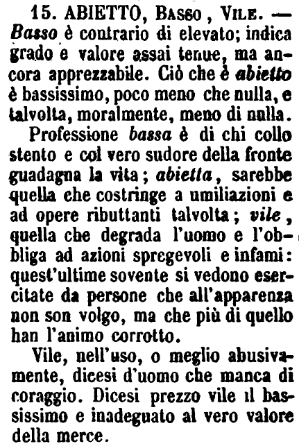 | Abietto, Basso, Vile - Basso è contrario di elevato; indica grado e valore assai tenue, ma ancora apprezzabile. Ciò che è abietto è bassissimo, poco meno che nulla, e talvolta, moralmente, meno di nulla.