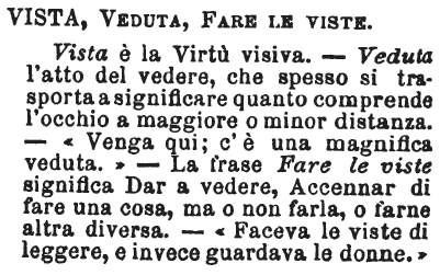 | Vista, Veduta, Far le visite - Vista è la Virtù visiva. - Veduta l'atto del vedere, che spesso si trasporta a significare quanto comprende l'occhio a maggiore o minor distanza. - «Venga qui; c'è una magnifica veduta.» - La frase Fare le viste significa Dar a vedere, Accennar di fare una cosa, ma o non farla, o farne altra diversa. - «Faceva la viste di leggere, e invece guardava le donne.» [immagine] |