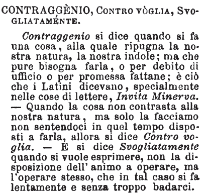 Contraggenio, Contro voglia, Svogliatamente - Contraggenio si dice quando si fa una cosa, alla quale ripugna la nostra natura, la nostra indole; ma che pure bisogna farla, o per debito di ufficio o per promessa fattane; è ciò che i Latini dicevano, specialmente nelle cose di lettere, Invita Minerva. - Quando la cosa non contrasta alla nostra natura, ma solo la facciamo non sentendoci in quel tempo disposti a farla, allora si dice Contro voglia. - E si dice Svogliatamente quando si vuole esprimere, non la disposizione dell'animo a operare, ma l'operare stesso, che in tal caso si fa lentamente e senza troppo badarci. [immagine]