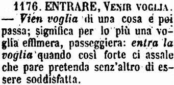 Entrare, Venir voglia - Vien voglia di una cosa e poi passa; significa per lo più una voglia effimera, passeggiera: entra la voglia quando così forte ci assale che pare pretenda senz'altro di essere soddisfatta. [immagine]