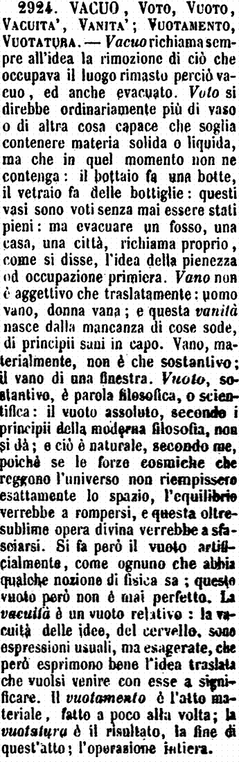 | Vacuo, Voto, Vuoto, Vacuità, Vanità; Vuotamento, Vuotatura - Vacuo richiama sempre all'idea la rimozione di ciò che occupava il luogo rimasto perciò vacuo, ed anche evacuato. Voto si direbbe ordinariamente più di vaso o di altra cosa capace che soglia contenere materia solida o liquida, ma che in quel momento non ne contenga: il bottaio fa una botte, il vetraio fa delle bottiglie: questi vasi sono voti senza mai essere stati pieni: ma evacuare un fosso, una casa, una città, richiama proprio, come si disse, l'idea della pienezza od occupazione primiera. Vano non è aggettivo che traslatamente: uomo vano, donna vana; e questa vanità nasce dalla mancanza di cose sode, di principii sani in capo. Vano, materialmente, non è che sostantivo; il vano di una finestra. Vuoto, sostantivo, è parola filosofica, o scientifica: il vuoto assoluto, secondo i principii della moderna filosofia, non si dà; e ciò è naturale, secondo me, poichè se le forze cosmiche che reggono l'universo non riempissero esattamente lo spazio, l'equilibrio verrebbe a rompersi, e questa oltresublime opera divina verrebbe a sfasciarsi. Si fa però il vuoto artificialmente, come ognuno che abbia qualche nozione di fisica sa; questo vuoto però non è mai perfetto. La vacuità è un vuoto relativo: la vacuità delle idee, del cervello, sono espressioni usuali, ma esagerate, che però esprimono bene l'idea traslata che vuolsi venire con esse a significare. Il vuotamento è l'atto materiale, fatto a poco alla volta; la vuotatura è il risultato, la fine di quest'atto; l'operazione intiera. [immagine] |