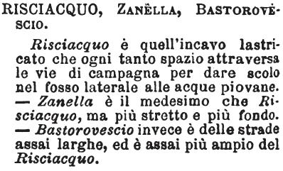 Risciacquo, Zanella, Bastorovescio - Risciacquo è quell'incavo lastricato che ogni tanto spazio attraversa le vie di campagna per dare scolo nel fosso laterale alle acque piovane. - Zanella è il medesimo che Risciacquo, ma più stretto e più fondo. - Bastorovescio invece è delle strade assai larghe, ed è assai più ampio del Risciacquo. [immagine]