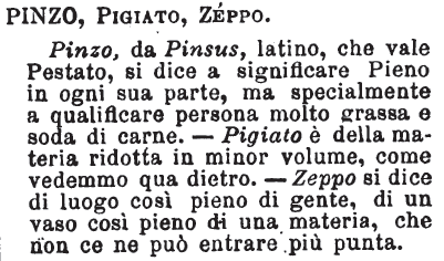 | Pinzo, Pigiato, Zeppo - Pinzo, da Pinsus,, latino, che vale Pestato, si dice a significare Pieno in ogni sua parte, ma specialmente a qualificare persona molta grassa e soda di carne. - Pigiato è della materia ridotta in minor volume, come vedemmo qua dietro. - Zeppo si dice di luogo così pieno di gente, di un vaso così pieno di una materia, che non ce ne può entrare più punta. [immagine] |